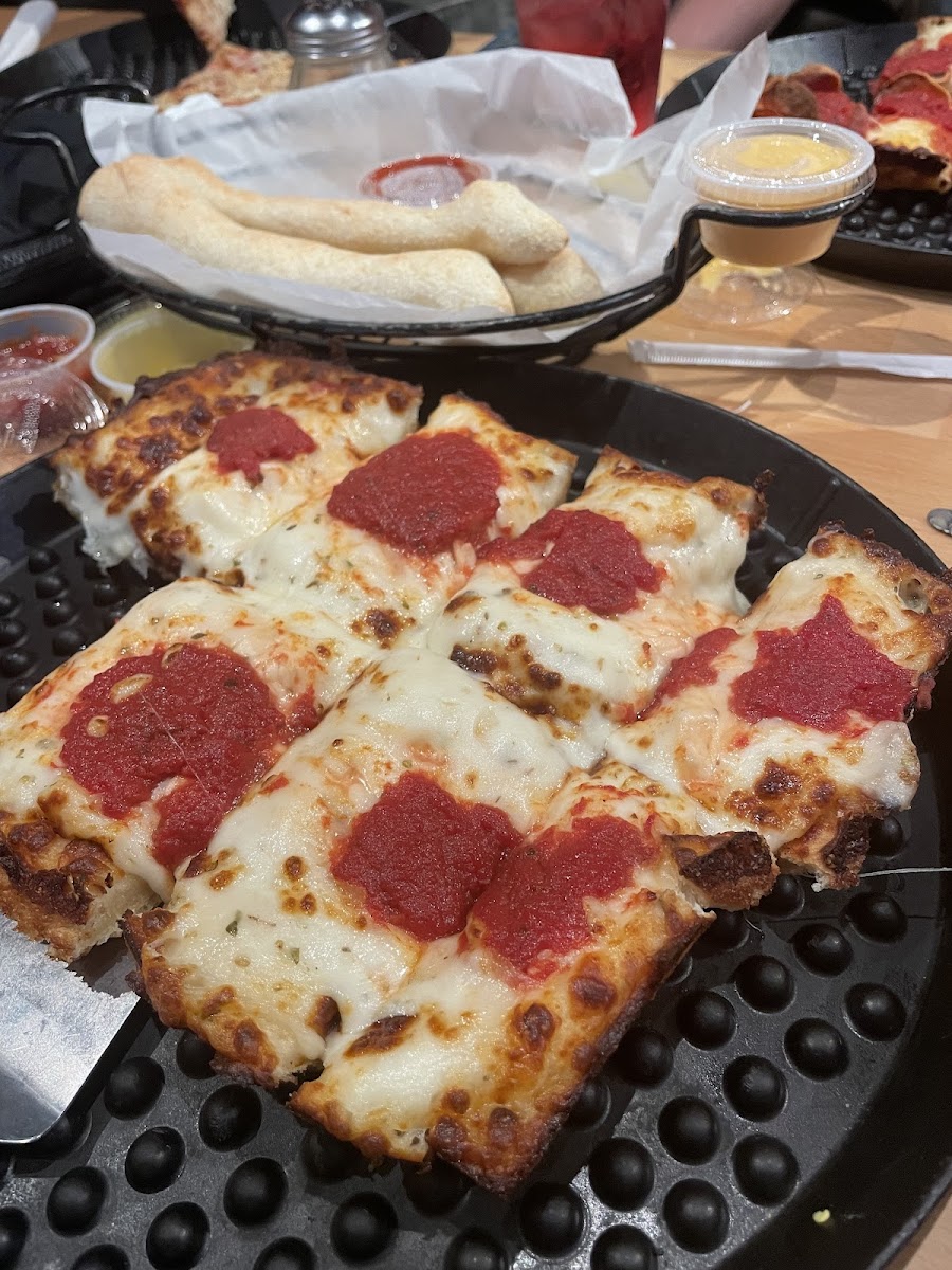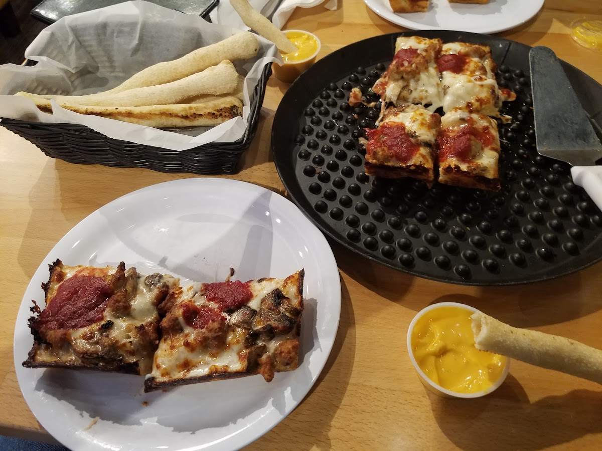Sausage and Mushroom Deep Dish Cheese Pizza with Bread Sticks